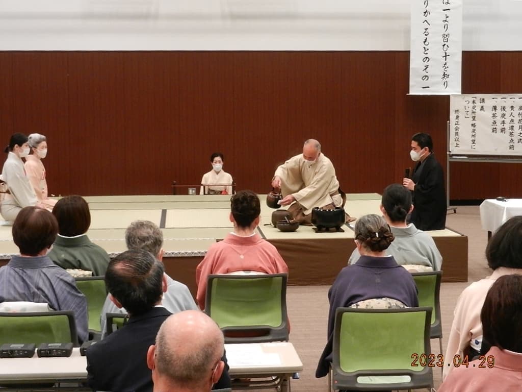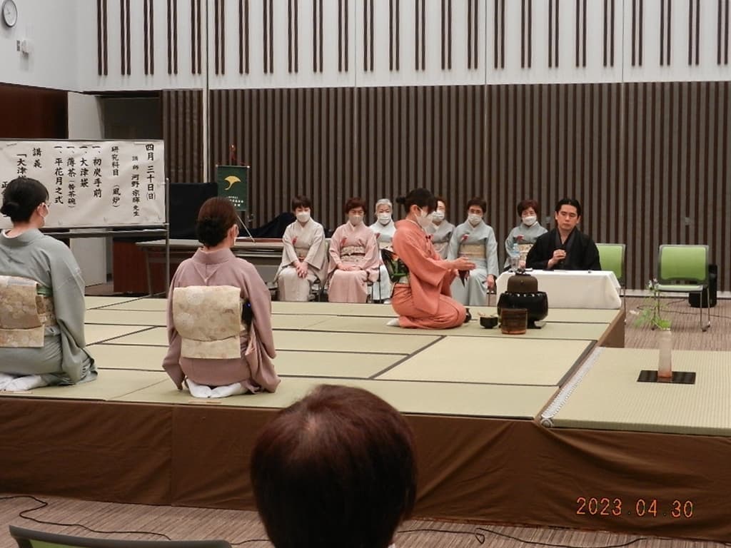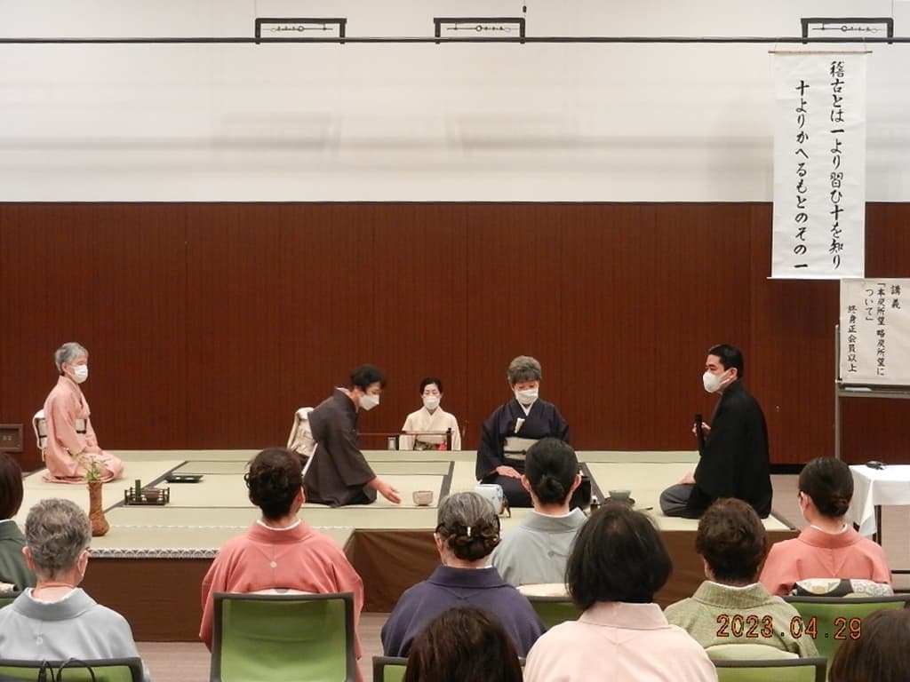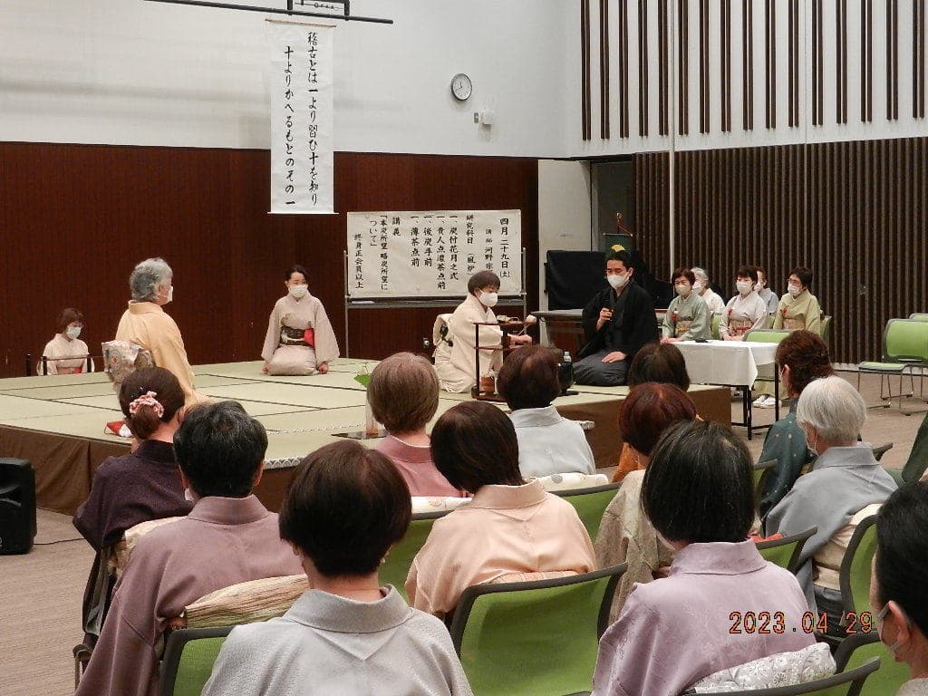令和5年4月29・30日にいわき産業創造館(ラトブ)にて、令和5年度の研究会を開催しました。 一日目(4月29日)講師:河野宗輝先生講義:「本炭所望、略炭所望について」 炭付花月之式 貴人点濃茶点前 後炭手前 薄茶点前 講義 二日目(4月30日)講義:「大津袋について」支部の要望により河野先生にはマスクを外していただきました。 初炭手前 大津袋 薄茶(替茶碗) 平花月之式